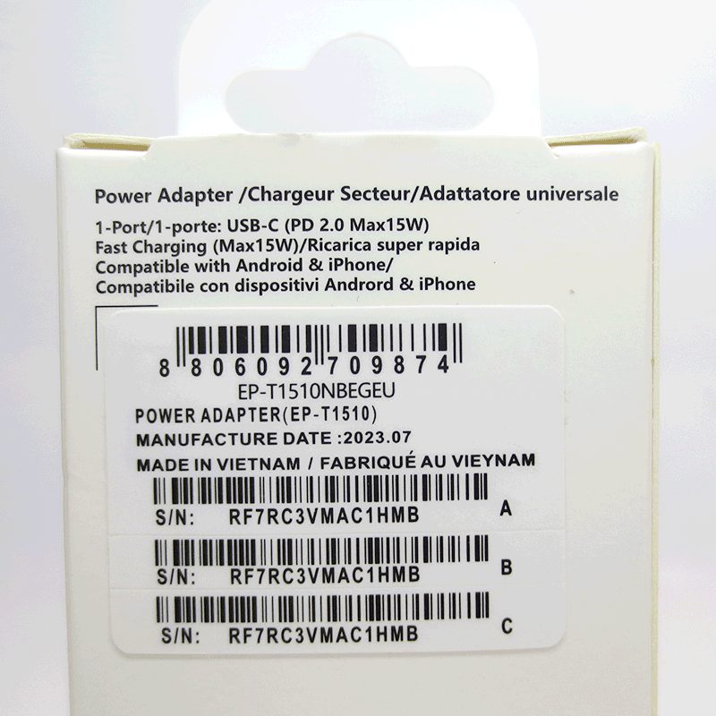 بر روی جعبه این شارژر 15 واتی اصلی سامسونگ شماره سریال و کد استعلام اصالت وجود دارد و میتوان گفت این محصول از بالاترین کیفیت های موجود در بازار است چرا که کالای اورجینال و تولید ویتنام با سریال معتبر است.